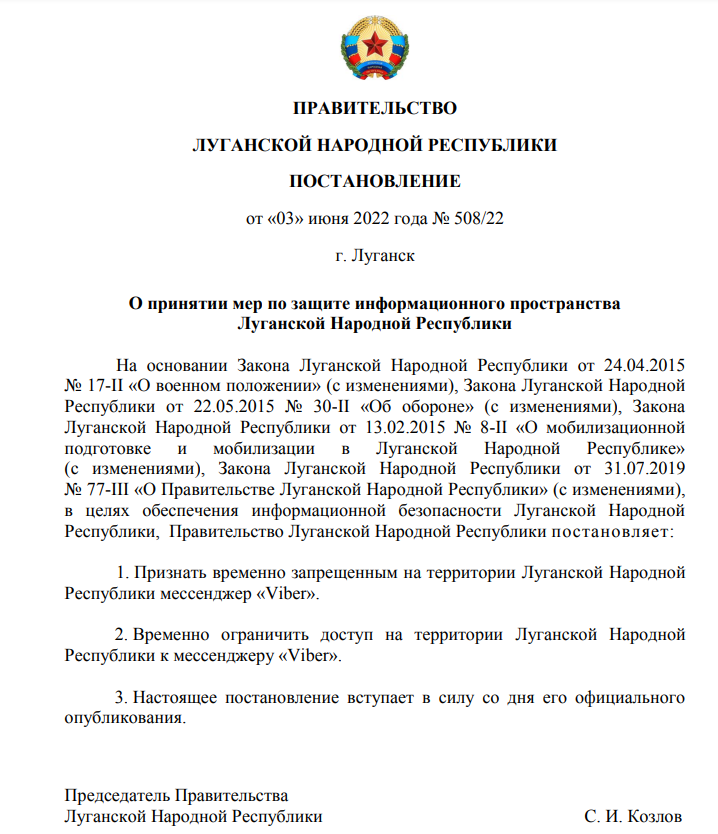 Согласно постановлению правительства ЛНР от 03.06.2022 мессенджер Viber признан запрещённым.